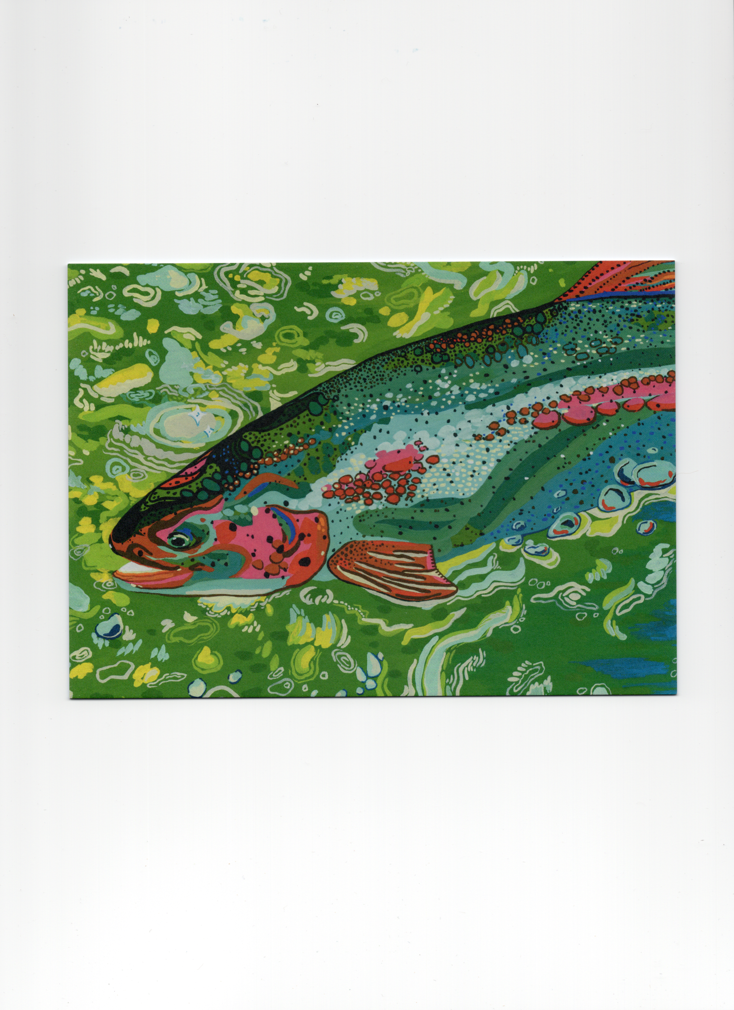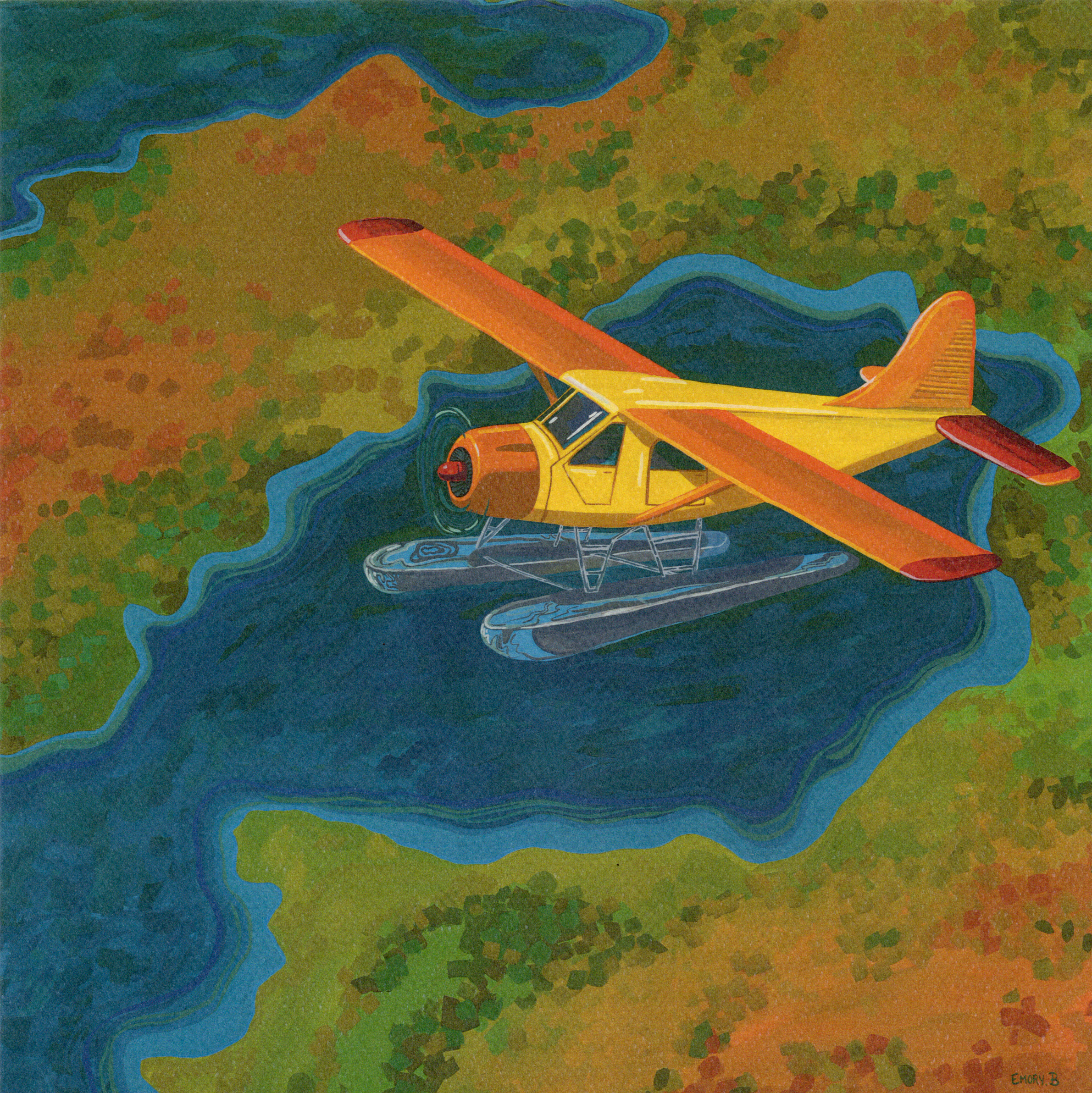 Tundra Caribou, is a print of Emory’s original gouache painting. This print is framed in a brown wood with ½ wooden spheres on the edges.